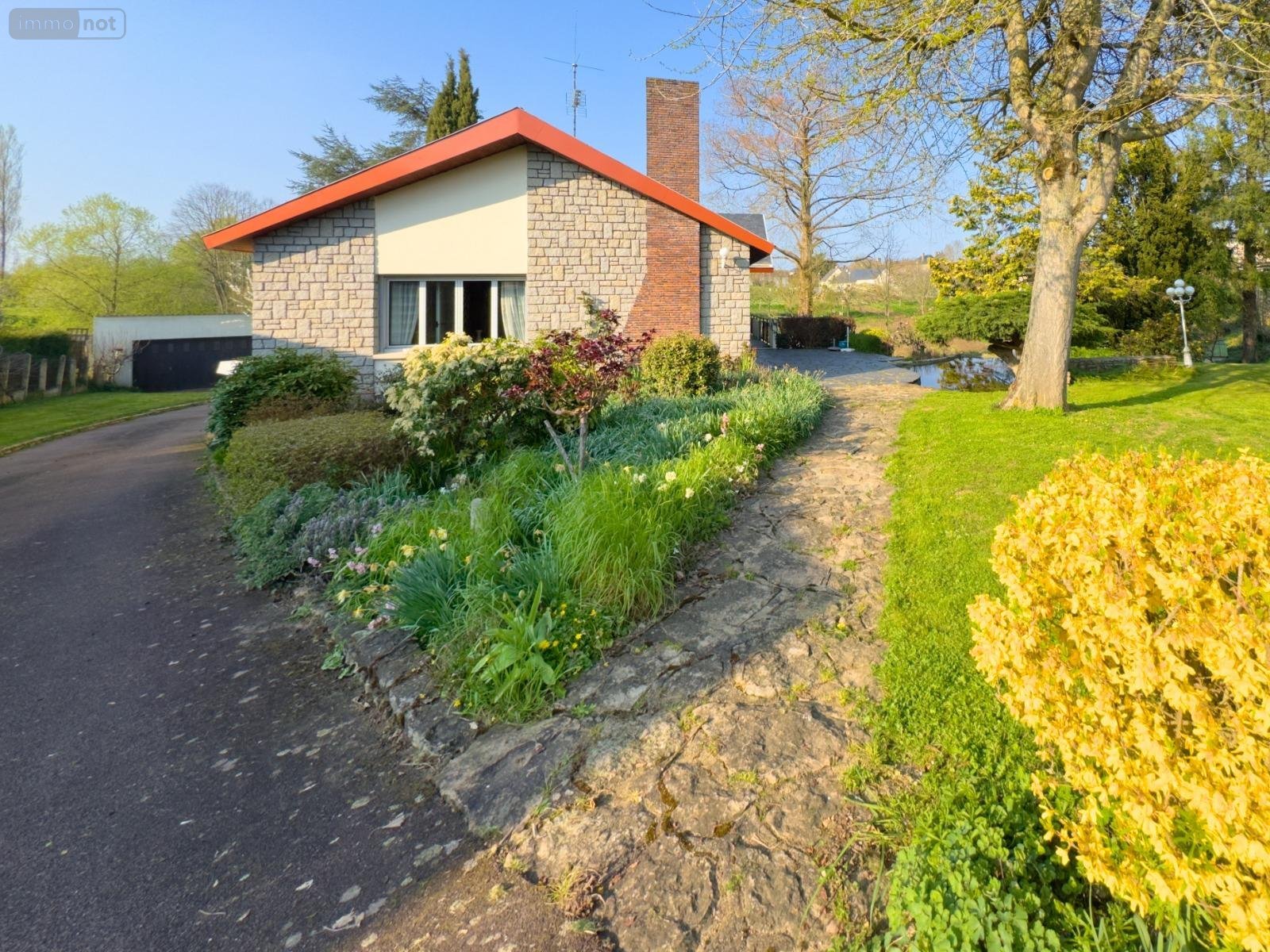 Terrain clos et paysagé avec deux bassins, comprenant un grand garage et un abri de jardin.