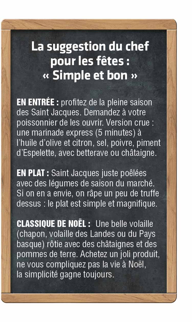 Christian Etchebest : Comme chaque année, la mayonnaise commence à prendre… À base de truffes, d'un peu de caviar… on invite à la table des produits festifs que les gens apprécient pour les fêtes. Sans oublier de soigner la déco de Noël qui ajoute du charme à nos restaurants.